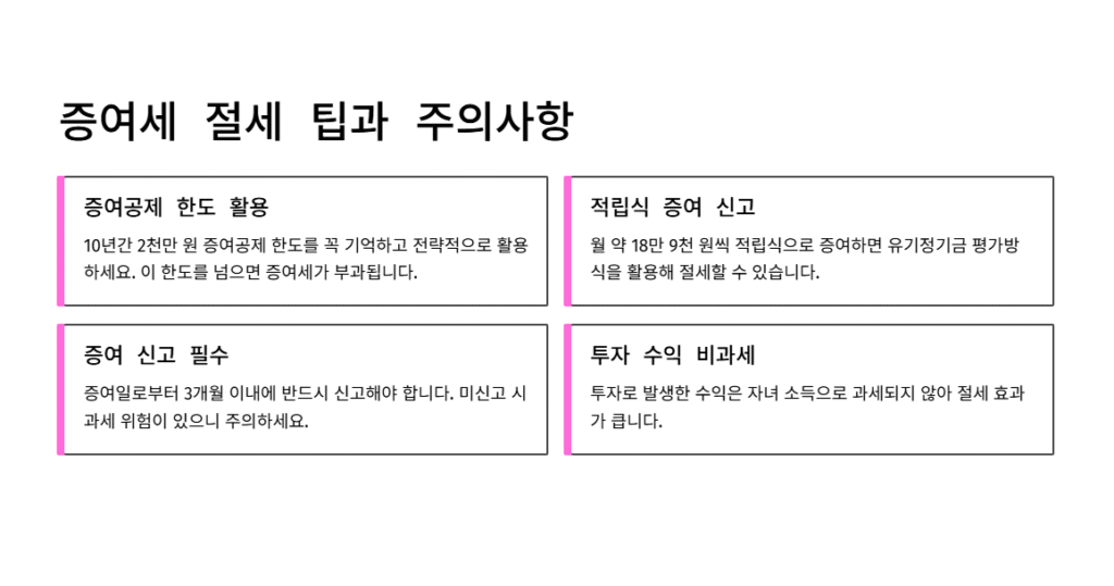 이 한도를 10년마다 활용하면, 자녀가 20세가 되기 전까지 총 4,000만 원을 합법적으로 증여할 수 있습니다.